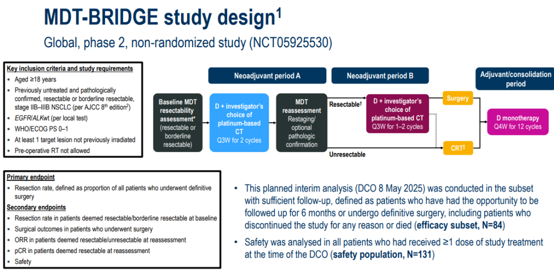 参考文献Reck M.Neoadjuvant durvalumab(D)+chemotherapy(CT)followed by either surgery(Sx)and adjuvant D or CRT and consolidation D in patients(pts)with resectable or borderline resectable stage IIB–IIIB NSCLC:interim analysis(IA)of the phase 2 MDT-BRIDGE study.2025 ESMO,LBA65
