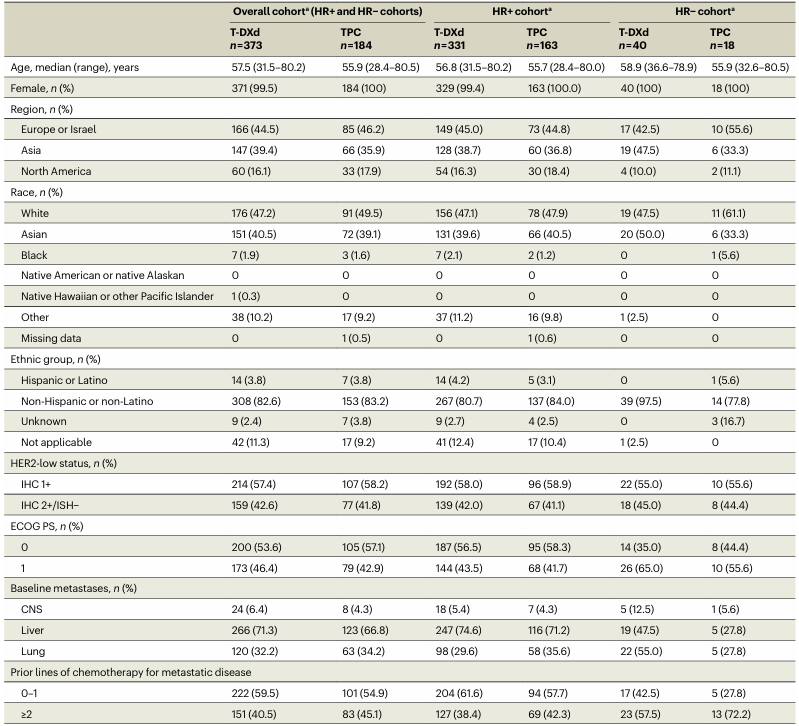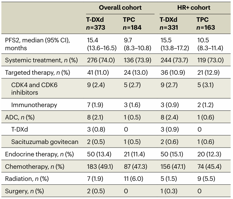 在HR+患者队列中,T-DXd组和TPC组患者接受的最常见的后续首选治疗方案分别为化疗[156例(47.1%)vs.74例(45.4%)]和内分泌治疗[50例(15.1%)vs.20例(12.3%)];T-DXd组有8例(2.4%)患者,TPC组有1例(0.6%)患者接受了ADC作为后续首选治疗方案。
