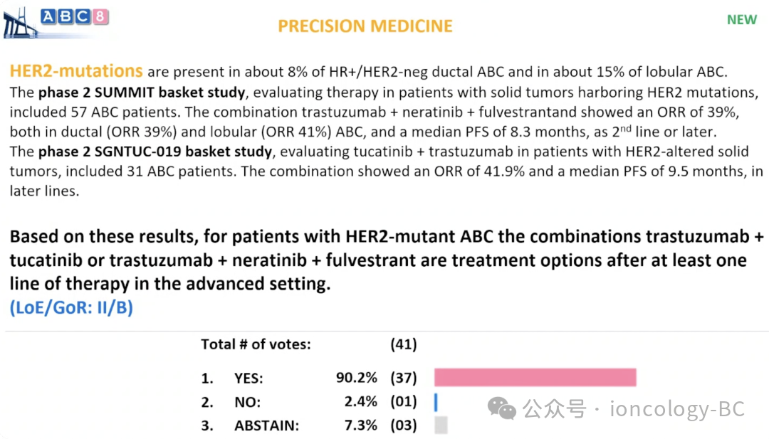 SUMMIT篮子研究第二阶段评估了携带HER2突变的实体瘤患者(包括57例ABC患者)的治疗方案。曲妥珠单抗+奈拉替尼+氟维司群联合治疗的ORR为39%(导管型ABC的ORR为39%,小叶型为41%),作为二线或更后线治疗的中位无进展生存期(PFS)为8.3个月。