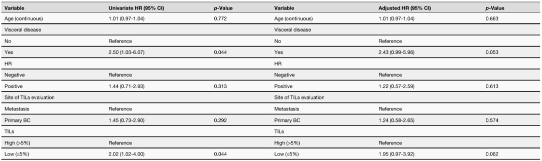 研究者检验了TIL水平与PFS之间的相关性,并校正了年龄、累及内脏、HR状态和TIL评估部位等临床变量。单变量分析显示,TIL水平较低与PFS较差相关(HR=1.74,P=0.024)。校正上述临床变量后,这种关联仍然显著(HR=1.77,P=0.024)。当将TIL视为连续变量(每10%增量)时,TIL水平较高与更好的预后相关,但统计学上并不显著。