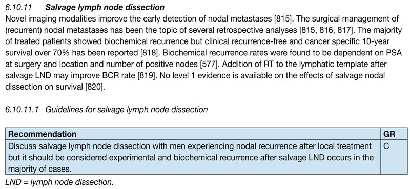 2016EAU前列腺癌指南对挽救性淋巴结清扫术的地位进行了更新。推荐医生与患者探讨进行挽救性淋巴结清扫术的潜在获益,同时也说明这样的手术尚是探索性的,而且大部分患者在术后还会再次出现生化复发。需要说明的是,目前还缺乏来自随机试验并支持挽救性淋巴结清扫术的I级证据。