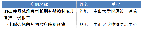 经过初步筛选,入围2例晚期肾癌靶向药物治疗病例,最终将有1例晋级。病例名称及选手信息如下: