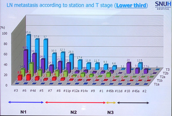 随着手术硬件条件的进步,该中心针对不同站淋巴结标本,开展了相关研究。结果发现,根据TN分期的不同,N1站出现淋巴结转移的百分比随着T分期的升高而升高(见图2)。其中以3组淋巴结发生转移的概率最高,在T3期胃癌中,在65.6%的3组淋巴结中发现了转移的胃癌细胞。在N2和N3站淋巴结转移中也有类似的规律。在N2站淋巴结中,7组淋巴结发生转移的概率最高,在T3期的胃癌中,在32.3%的7组淋巴结中发现了转移的胃癌细胞。在N3站淋巴结中,在T2b期的胃癌中,在20%的11组淋巴中发现了转移的胃癌细胞。
