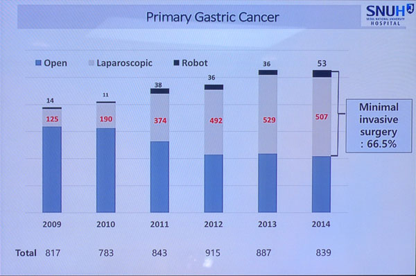 回顾2014年,Han-Kwang Yang教授所在的SNUH胃肠外科中心接待门诊病例12,600人次,其中新患者2230人次;开展外科手术1054台次,其中开腹方式419台,微创方式635台;开展临床研究31项,基础和转化医学研究19项;发表学术论文36篇,其中SCI收录21篇。他们在胃癌术式的选择、微创手术的应用、胃癌术后并发症等多个方面开展了深入研究。
