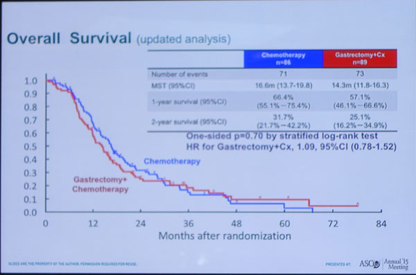 图5. 晚期胃癌患者手术联合化疗vs. 单纯化疗之总体生存