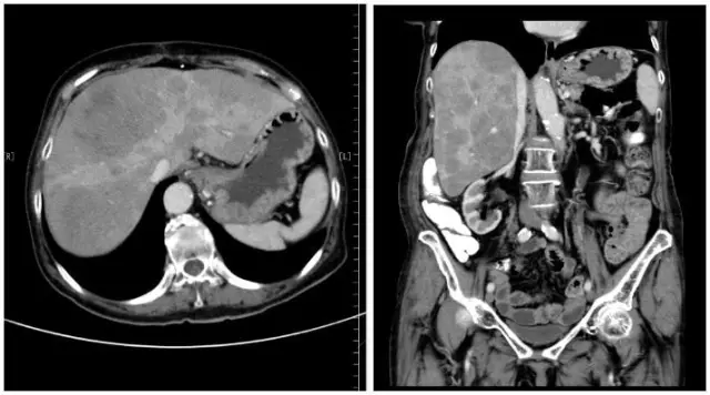 图1. 2014-8-07腹部增强CT:肝脏体积明显增大,实质内弥漫分布大小不等低密度结节及肿块,部分融合,增强扫描均呈不均匀低强化,最大约82 mm x61mm。考虑转移性。腹腔及腹膜后未见肿大淋巴结。