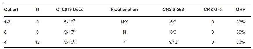 患者根据输注剂量的不同被分为4个研究队列。在队列1、2中,9例患者输注5×107  CTL019(6例1次输入,3例分次输入),其中6例出现3/4级细胞因子释放综合征(CRS),托珠单抗治疗有效; 3例(33%)患者疾病获得完全缓解(CR)。队列3中,6例患者1次输入5×108  CTL019,其中3例死于CRS,对糖皮质激素和托珠单抗无效,血培养显示合并败血症;另3例患者获得CR。12例患者计划分次(10% d1, 30% d2 和60% d3)输入5×108  CTL019,若早期出现CRS症状则后续CTL019输注剂量调整,出现3级CRS时抗细胞因子治疗。队列4中,12例患者中9例发生可控的3/4级CRS;客观缓解率(ORR)为 83%(CR9例和PR1例)。