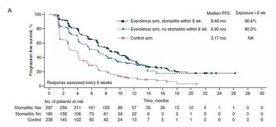 通过局部或全身的支持性干预并结合必要时的依维莫司剂量调整,绝大部分(>97%)患者的口腔炎能够完全缓解,对患者的无进展生存无不良影响。不仅如此,多项研究显示,发生口腔炎可能预示更好的预后,在治疗前8周出现口腔炎的患者具有更长的无进展生存期(图1)。