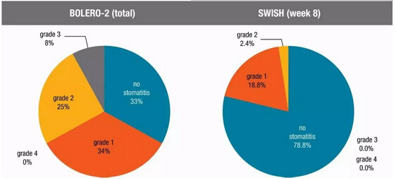 SWISH研究通过与历史对照对比证实,在接受依维莫司联合依西美坦治疗的晚期乳腺癌患者中,含糖皮质激素的漱口水大幅度减少口腔炎的发生,特别是2级及以上口腔炎减少了90%以上。同时在进食和口腔疼痛等患者报告结局方面也显示出良好获益。研究中,依维莫司和依西美坦保持很高的剂量强度,含地塞米松漱口水的预防性应用在其中发挥了一定作用。SWISH研究的设计实用,而且临床操作可行性强,含糖皮质激素的漱口水方案有效且整体耐受性好、毒性轻微,有望成为晚期乳腺癌患者在接受依维莫司/依西美坦治疗时预防口腔炎的标准方案。不过研究中采用的激素剂量较高,不知是否与较高的真菌性口腔炎发生率有关,临床也许可探讨降低激素浓度是否也同等有效。