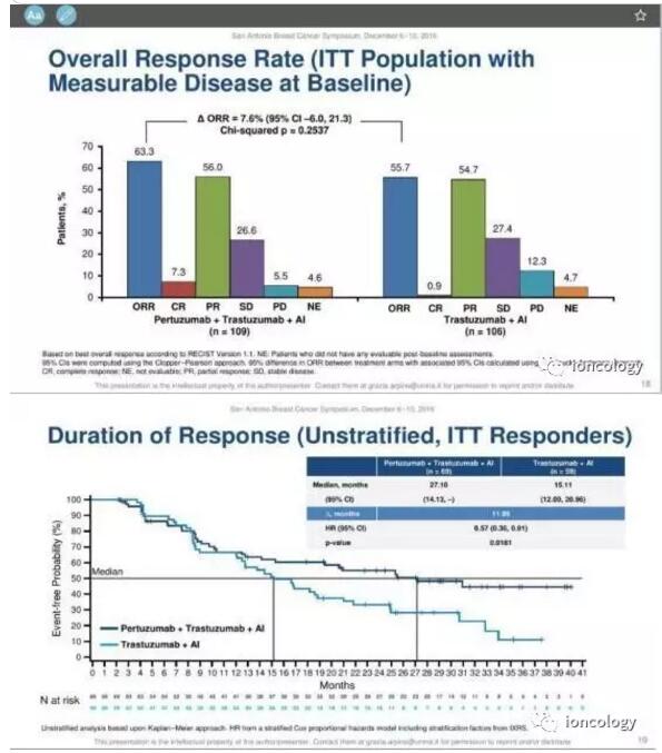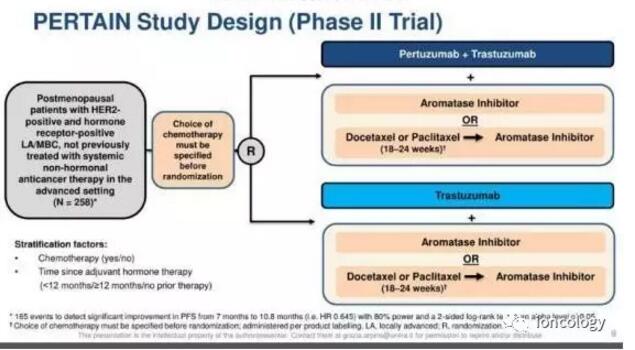 临床前和临床证据提示在乳腺癌中HER2与雌激素受体信号通路的交叉通路会导致治疗抵抗,对HER2阳性转移性乳腺癌患者一线应用帕妥珠单抗联合曲妥珠单抗和多西他赛与应用曲妥珠单抗联合多西他赛的患者相比可以显著改善患者的无进展生存(PFS)和总生存(OS)。PERTAIN(NCT01491737)是在绝经后激素受体阳性及HER2阳性的局部晚期转移性乳腺癌患者中评估一线应用帕妥珠单抗联合曲妥珠单抗及AI应用(或不应用)紫杉类药物的治疗效果。