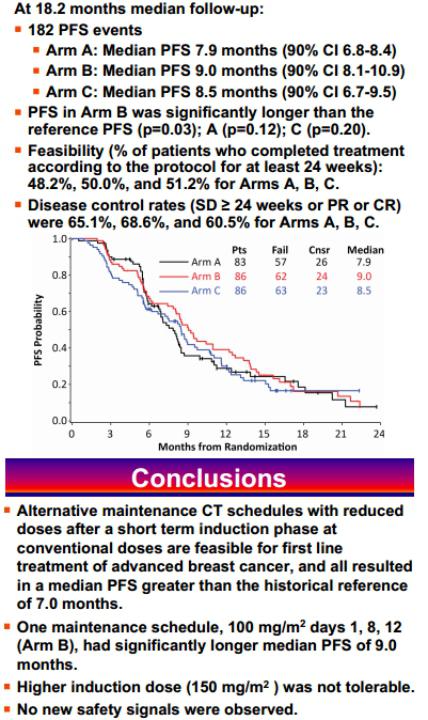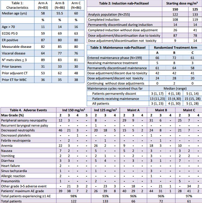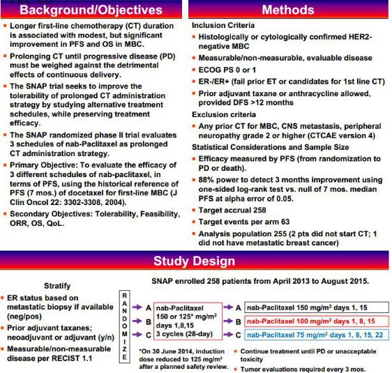 Alessandra Gennari介绍说,SNAP试验是一项随机研究,研究的目的是探讨一线化疗中白蛋白紫杉醇初始剂量150 mg/m2 ( days 1,8,15 Q28)三周期诱导化疗后的最佳维持剂量,以实现等效于或甚至优于历史对照组单药多西紫杉醇7个月的无进展生存。该试验将来自欧洲各地的258名患者随机分为三个不同的组,分别给予150 mg/m2  (days 1,15 Q28)、100 mg/m2 (days 1,8,15 Q28)、75 mg/m2 (days 1,8,15,22 Q28)三种不同的白蛋白紫杉醇维持剂量。使用多西紫杉醇一线治疗MBC的PFS(基于AVADO研究)做对照,然后将不同维持剂量组的PFS与之对比,以确定三种方案中的哪一种剂量疗效最好。