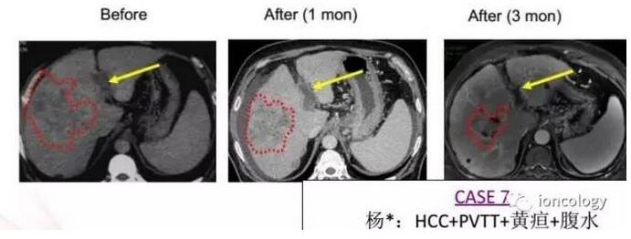 除肝癌术后复发的患者外,阿帕替尼用于初治的晚期肝癌的疗效如何呢?令人惊喜的是,针对一例合并门静脉及肠系膜上静脉癌栓、黄疸和腹水的肝癌患者,一线阿帕替尼治疗3个月后,原发灶和癌栓均有缩小,疗效评价为SD,无进展生存时间已超过12个月。
