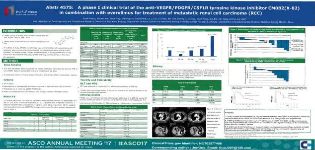 在本届ASCO会议上,由北京大学肿瘤医院肾癌黑色素瘤内科郭军教授作为主要研究者开展的CM082联合依维莫司用于晚期肾癌的Ⅰ期临床研究初步结果入选壁报展示(摘要号:4575),这也是本届ASCO大会泌尿肿瘤专题中唯一来自国内的临床研究。