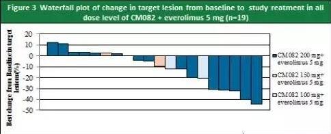 结果显示:仅在CM082的200mg剂量组发生了一例剂量限制性毒性(DLT),为4级血小板下降,研究未达到最大耐受剂量(MTD),CM082的200mg Qd联合依维莫司5mg Qd作为推荐剂量进行了剂量扩组。本研究显示联合治疗的耐受性良好,主要的3/4级不良反应分别为:高血压(13.6%)、贫血(9.1%)、中性粒细胞下降(9.1%)。