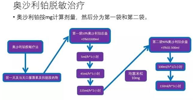 本研究采用的奥沙利铂的脱敏疗法是在参考多个国外癌症中心的奥沙利铂脱敏方法的基础上,对标准的奥沙利铂12步脱敏疗法进行改良,使脱敏疗法的药物配置和使用更加简便,可以很好地减少医务人员的工作量和配药失误的可能性。