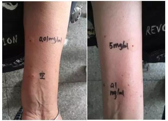 结果   2016年6月至2017年4月126例在本中心接受含奥沙利铂方案治疗的患者中,14例(11.1%)发生奥沙利铂过敏。男性8例,女性6例,中位年龄51岁(43∽73岁)。奥沙利铂过敏发生周期数为8周期(5∽10周期)。I、II度过敏反应10例,III度过敏反应4例,无IV度过敏反应的患者。14例患者的皮试结果为:13例阳性。其中1例患者3个浓度梯度组均阳性(图4),其余12例患者均只在5mg/ml剂量组才阳性。皮试结果与临床的符合率为92.9%。除1例III度过敏反应的患者拒绝继续接受奥沙利铂治疗,其余13例均接受了奥沙利铂的再使用。10例I、II度过敏反应患者接受了抗过敏药物预处理联合奥沙利铂减慢速率的干预措施。其中8例顺利完成了奥沙利铂的既定剂量,2例再次出现II度的过敏反应,进入下一干预措施。该2例及另外3例III度过敏患者接受抗过敏药物预处理联合奥沙利铂脱敏治疗的干预措施,均顺利完成了既定剂量的奥沙利铂。总体再使用的成功率为100%。