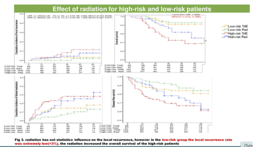 本次ASCO的poster报告中,华西王自强教授针对中低位直肠癌患者开展对比单纯手术治疗和术前新辅助化疗疗效的研究(摘要3527)发现,术前新辅助化疗能够改善高危直肠癌患者的OS(82% vs 70%),但这两者在低风险人群中无显著差异。该研究提示我们,针对转移高风险患者采用全程新辅助治疗在患者耐受性、新辅助治疗完成率、控制远处转移以及改善患者生存等方面前景广阔,相信未来会不断开展更多相关的前瞻性研究以证实。