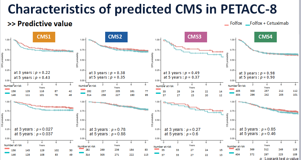 本次大会有多项研究探讨了结直肠癌的分子特征共识分型(CMS)对于早期结直肠癌患者预后和疗效预测的指导价值(摘要3509、3514、3515)。其中摘要3509通过NanoString 分析方法对于PETACC-8III期研究中共1779例患者进行了CMS分子分型,并以此为基础探讨了4种CMS分型患者在临床病理特征、基因突变状态、预后以及对不同治疗方案疗效方面的差异。该研究的主要结论如下:结直肠癌患者的CMS分型具有独特的临床和分子特征;CMS4型III期结肠癌患者的预后普遍较差;在CMS4型患者中,Marisa C4亚型的预后具有明显差异; CMS1型以及Marisa C2和C6患者亚型呈现对于西妥昔单抗治疗不敏感的趋势。这些发现对于早期结直肠的诊断和治疗有重要的指导价值。