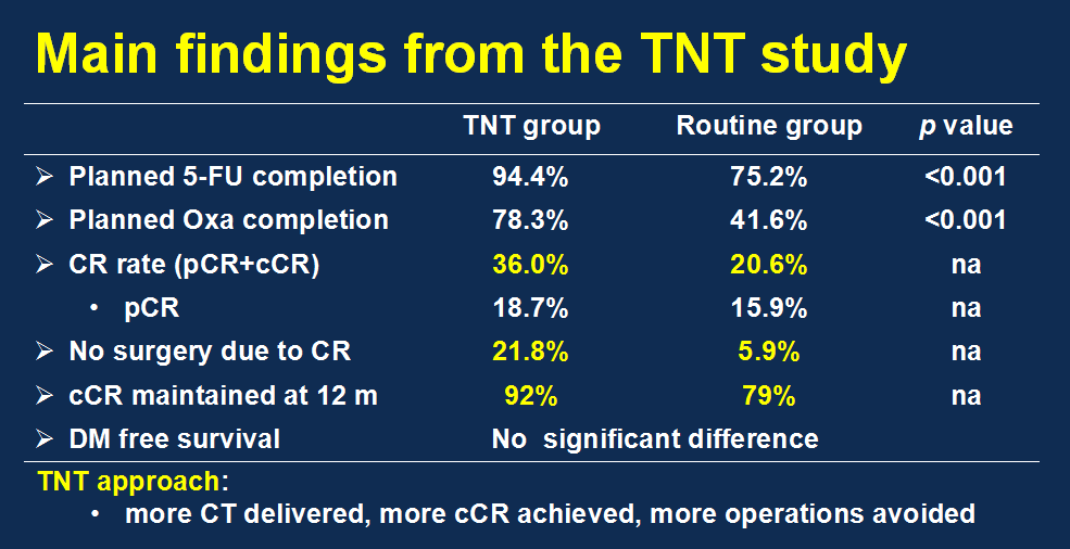 中低位直肠癌新辅助治疗的问题也是本次大会的一大亮点,术前全程新辅助治疗(TNT)的概念得到进一步深化。MSKCC研究(摘要3519)报告中包含了大量的数据样本量,对前期几十年的研究数据进行了汇总,超过几百例患者入组接受全程新辅助治疗,研究结果颇为可观。与常规治疗相比,接受TNT患者的疾病缓解率明显提高(36.0%vs20.6%),且提高了因疾病完全缓解而免于手术治疗的患者比例(21.8%vs5.9%)。研究提示,全程新辅助治疗有望成为中低位直肠癌的新治疗模式,但是关于TNT的具体方案选择、剂量和持续时间还有待进行更多的探索。