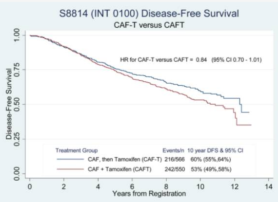 目前临床上对化疗联合内分泌治疗讳莫如深的观念,多半来源于NCCN指南中引用的SWOG 8814研究。该研究旨在探索对于激素受体阳性、淋巴结阳性的的早期乳腺癌患者,在术后他莫昔芬(F)辅助治疗5年基础上,联合或序贯CAF方案能提高患者的生存,且CAFT方案与CAF-T方案孰优孰劣。最终结果显示,CAF-T/CAFT的无病生存期(DFS)和总生存期(OS)都显著优于T, CAF-T组相较于CAFT组,有改善DFS的趋势 (HR=0.84, P=0.055)。但仅凭这单个研究的结果,难以明确化疗与他莫昔芬能否联合应用。