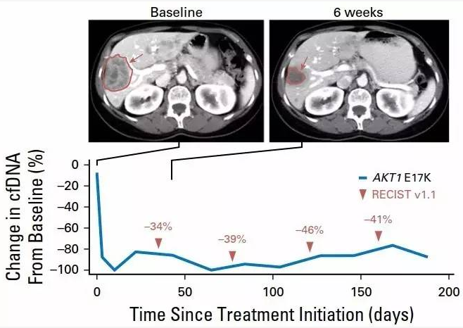 下方曲线为血液中肿瘤相关cfDNA的动态检测。与治疗缓解相对应,基线时cfDNA最高,治疗6周后大幅下降,随后一直处于低位。
