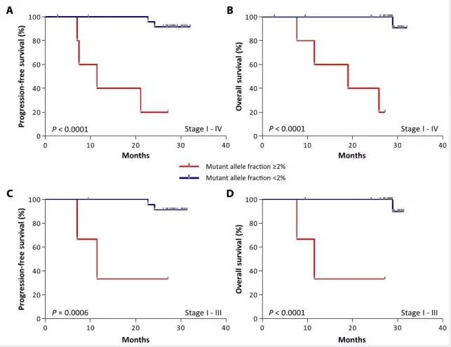 此外,在所有癌症患者中都观察到一个现象,即随着疾病的分期的增加,血液检测的诊断准确性也有所提高。在结直肠癌亚组中,8例Ⅰ期疾病患者中有4例能够监测到cfDNA突变,9例II期疾病中有8例,10例III期中9例,15例IV期中14例准确。在肺癌队列中,该检测方法能够准确预测29例I期癌症中的13例以及32例II期癌症中的23例的突变。在卵巢癌中,准确性为24例I期卵巢癌中的16例以及4例II期癌症中的3例。同样地,乳腺癌患者为3例I期乳腺癌中的2例和29例II期癌症中的17例。该研究还发现,44例健康个体的血液样本中没有发现与癌症相关的突变。