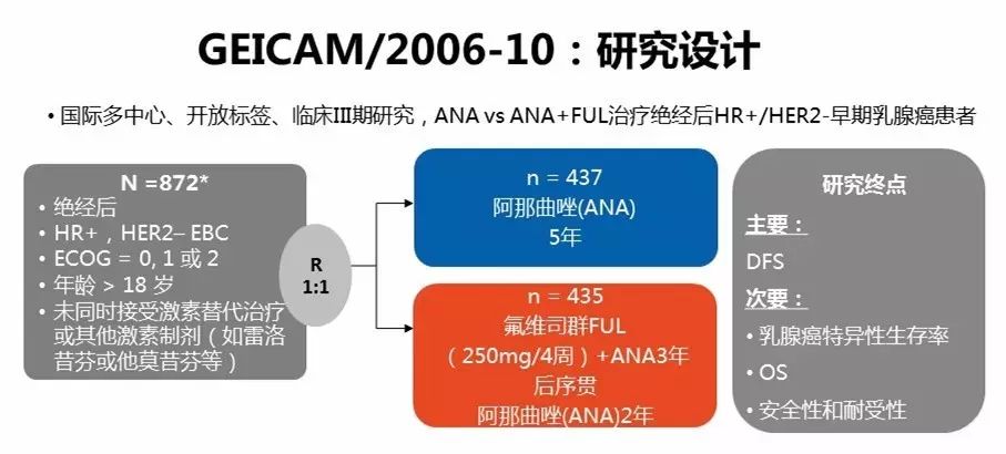 在计算样本量时,研究者以两个干预组5年DFS率绝对差异3%(A: 90%,A+F: 93%)为基准,估算需要共2716例患者。而在2010年FACT研究公布为阴性结果后,GEICAM/2006-10入组终止。自2008年至2010年,研究只纳入872例HR+/HER2-早期乳腺癌,其中437例接受A治疗(5年),435例接受A+F治疗(联合用药3年后序贯2年A)。