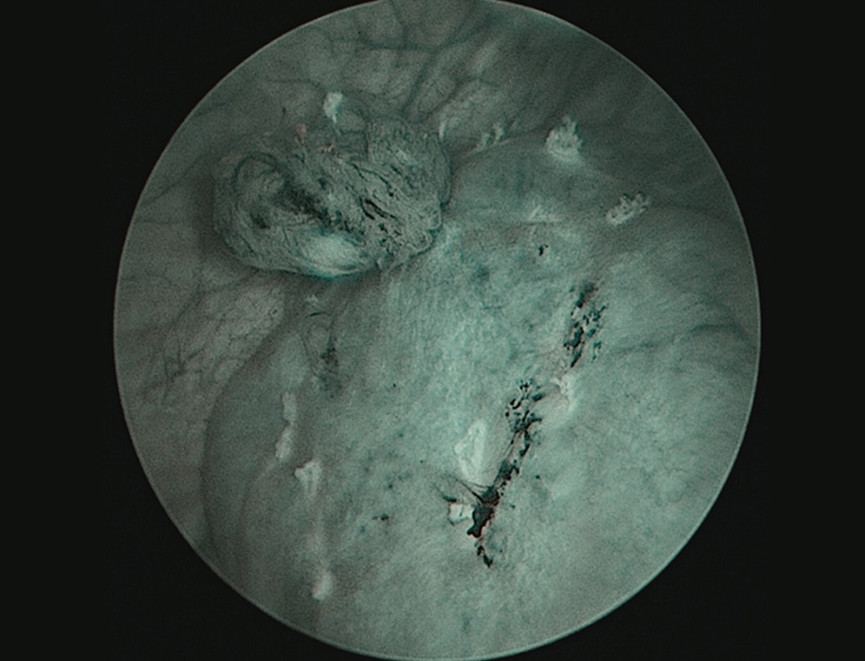 ?置入取物袋(?ALTON)套装肿瘤,收紧袋口,拉至膀胱镜头端,随膀胱镜自尿道内取出。重新置入膀胱镜,在SPECTR A模式下观察是否有肿瘤残余及副损伤(输尿管口损伤、膀胱穿孔),并创面止血。