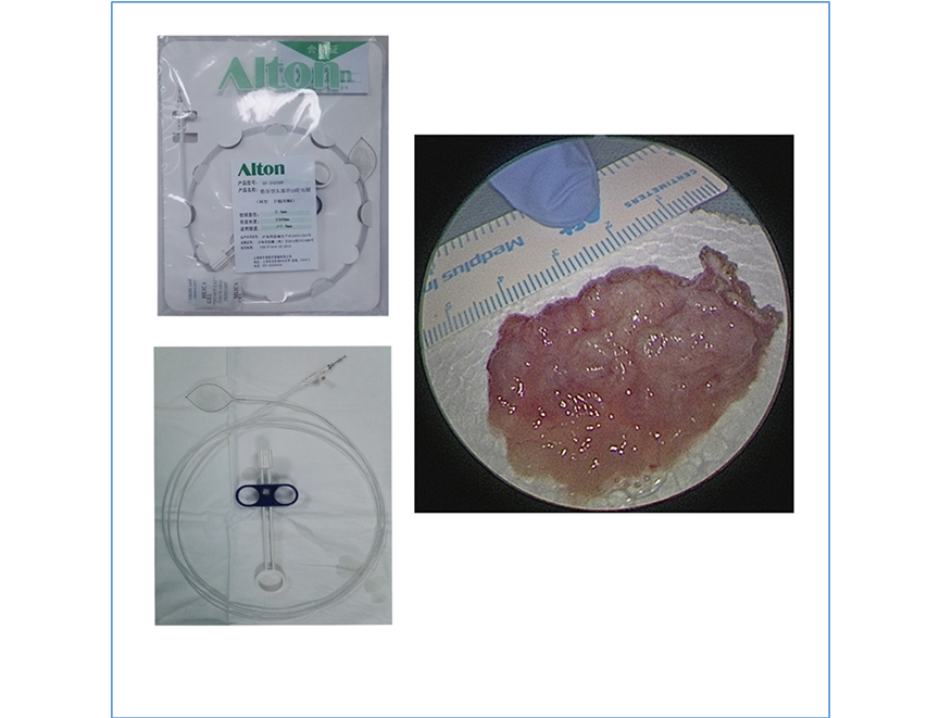 ?取出膀胱镜,尿道内置20Fr三腔尿管引流尿液备膀胱冲洗。最后将标本平铺固定送检病理。