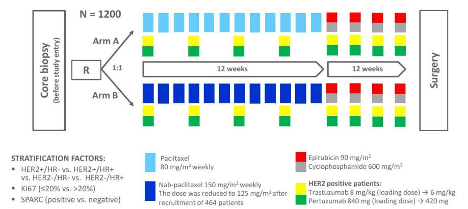 GeparSepto研究是由德国乳腺研究组(GBG)开展的一项随机对照Ⅲ期临床试验,旨在对比紫杉醇周疗或白蛋白紫杉醇周疗,序贯EC(表阿霉素+环磷酰胺)化疗作为早期乳腺癌新辅助治疗的疗效和安全性。主要研究终点是pCR率,次要终点包括无病生存(DFS)、总生存(OS)、安全性等。