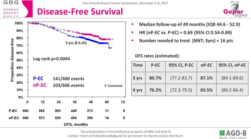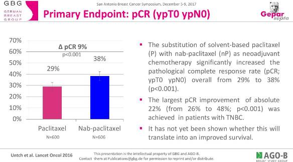本次SABCS公布了GeparSepto长期随访结果,发现白蛋白紫杉醇给患者带来的pCR率提升确实转化为远期生存获益。