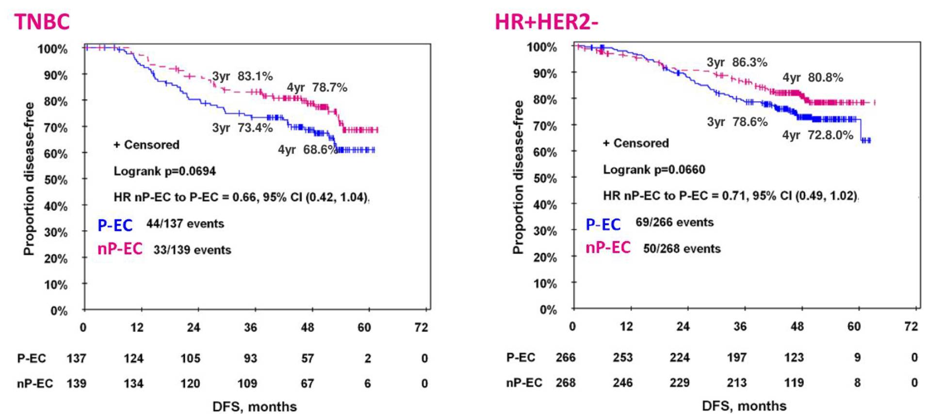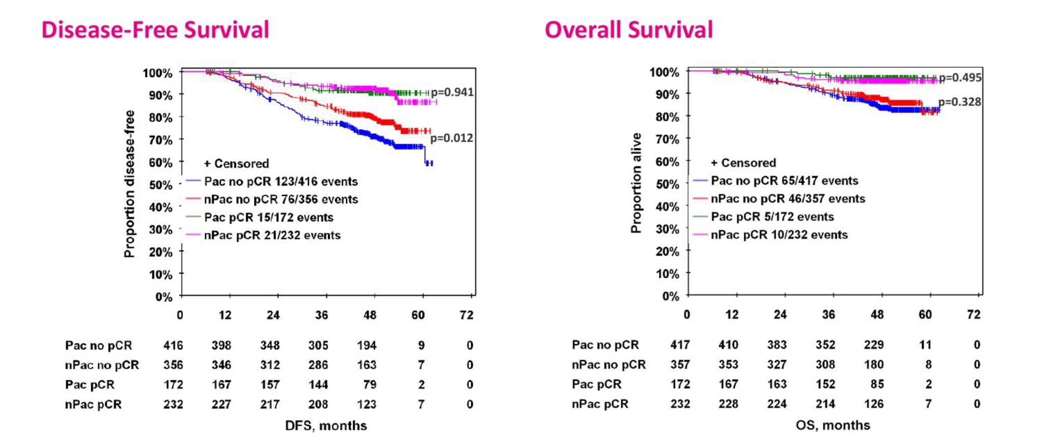 以pCR率为主要终点,研究发现白蛋白紫杉醇对比普通紫杉醇,前者使患者的pCR率明显提升,两组分别为38% vs 29%(P<0.0001);在三阴性乳腺癌中这一疗效差异更加令人振奋,两组pCR率分别为48% vs 26%(P<0.0001)。GeparSepto初期研究结果表明,对于早期高危乳腺癌患者,通过白蛋白紫杉醇序贯EC方案进行新辅助治疗,能够显著提高病理完全缓解率。而pCR改善能否转化为生存获益,使患者的远期预后更好呢?