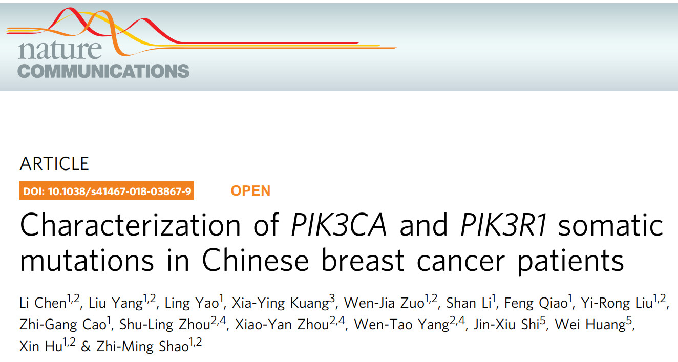 该工作对实施乳腺癌中实现“精准诊疗”具有重要的意义,4月11日,相关研究成果以题为“Characterization of PIK3CA and PIK3R1somatic mutations in Chinese breast cancer patients”的学术论文,在权威的科学杂志《自然·通讯》在线发表,影响因子(IF)达到12.124分。