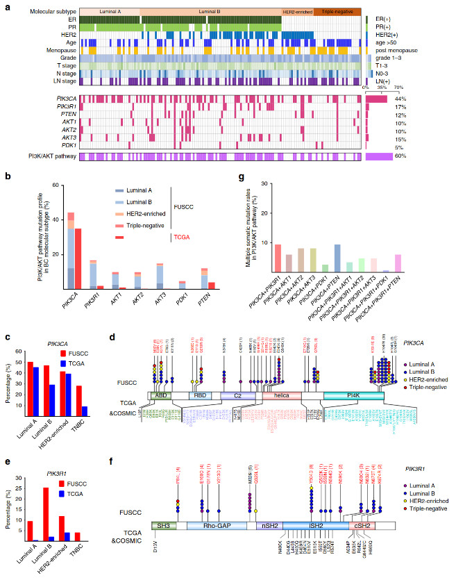 本项研究基于在复旦大学附属肿瘤医院接受乳腺癌手术的样本,针对该信号通路上的PIK3CA,PIK3R1,PTEN, AKT等七个基因的突变进行基因外显子组测序。经测序后发现,突变频率最高的是PIK3CA,占比达到44%,PIK3R1基因的突变频率为17%,这两个基因同时存在突变的情况占到了9%。