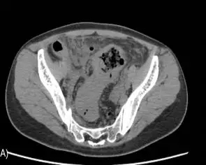图2 CT提示乙状结肠壁增厚