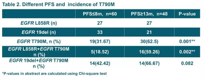 所有患者根据不同的PFS分为三组:长PFS组(PFS≥13个月) 、短PFS组(PFS≤8个月)以及正常PFS组(PFS为9-12个月)。相比长PFS组,短PFS组中T790M发生率更低。(详见表2)