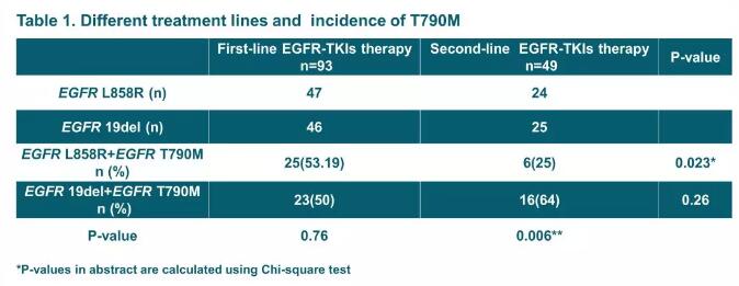 相比一线EGFR-TKIs治疗,二线使用TKIs治疗在携带L858R突变患者中T790M的发生率明显更低,但在19del突变患者中无显著差异。(详见表1)