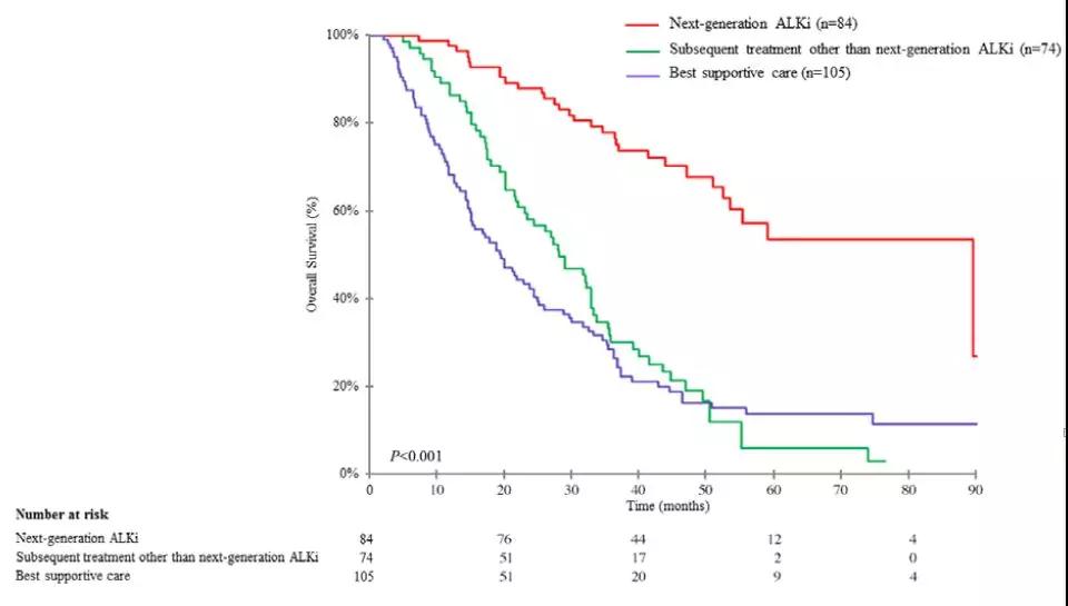 再看真实世界的情况,将塞瑞替尼用于克唑替尼治疗失败的患者得到了怎样的数据?讲到这个话题,我们肯定会想到法国开展的真实世界研究,这项研究大家非常关注,也有很多人看过其数据。这项研究主要是将克唑替尼耐药的人群分为三组,一组是不进行进一步治疗,一组选择ALK抑制剂以外的药物进行治疗,一组主要采用ALK抑制剂治疗。其中,在第三组,即ALK抑制剂治疗克唑替尼耐药患者中,塞瑞替尼占的比例非常高,占到了75%。这个人群治疗后,从中期数据来看,从克唑替尼治疗开始算到患者最后死亡,患者总的生存时间可以达到89.6个月,其中克唑替尼的贡献大约是在16个月左右,后续治疗的贡献达到了70多个月。所以说这是一个非常好的数据。这一组的89.6个月的总生存,要比其他两个组的OS均有非常好的提高(图1)。所以说从这样的真实世界情况来看,塞瑞替尼用于克唑替尼治疗失败的患者还是有非常不错的疗效。