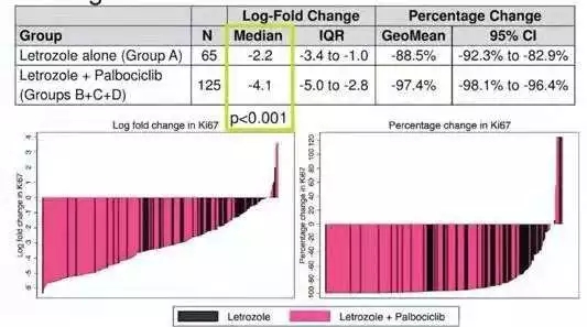 本次SABCS大会上公布的一项多中心随机Ⅱ期临床研究——PALLET,就是比较单药来曲唑和来曲唑联合使用CDK4/6抑制剂在雌激素受体阳性的绝经后早期乳腺癌患者的新辅助内分泌治疗疗效。入组标准为超声下大于2cm的ER阳性、HER2阴性的绝经后早期患者。患者分别在入组前、治疗2周和14周时取病理活检,从2015年2月至2018年3月随机入组英国和北美的307例中位年龄64-66岁的患者,分别给予来曲唑2.5mg/天,CDK4/6抑制剂75-125mg/天(持续三周停一周),按照国家及3:2:2:2随机分为A、B、C、D四组,A组为单药来曲唑14周、B组为单药来曲唑2周+联合CDK4/6抑制剂至14周、C组为单药CDK4/6抑制剂2周+联合来曲唑至14周、D组为两药联合14周,之后一直口服来曲唑至手术,术后30天至1年密切随访。主要观察终点是A组同其他三组的增殖指数Ki67的变化和14周后超声上的临床疗效。次要研究终点包括B、C两组的疗效区别以及安全性和耐受性,另外研究还纳入了c-PARP这个细胞凋亡的生物学标记物和14周后细胞周期完全停滞的标准(Ki67<2.7%)这两个观察终点。