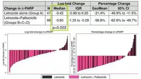 307例患者中(北美141例、英国166例)279例观察到了临床疗效变化,190例有前后的Ki67变化,A组和BCD三组超声评估的临床疗效无统计学差异(49.5%对54.4%),但A组和另外三组的Ki67变化(-2.2%和-4.1%)有明显统计学差异(p<0.001),联合用药的三组间无统计学差异。达到细胞周期完全停滞(Ki67<2.7%)和c-PARP的下降单药组和联合组同样差异明显(见下图),提示细胞增殖水平和凋亡之间呈负相关。在安全性和耐受性方面,联合组3级以上的无症状粒细胞减少的发生率明显高于单药组,但没有发现不同于以往的并发症。因此研究得出结论:同单药来曲唑相比,联合CDK4/6抑制剂可以明显提高对于恶性肿瘤增殖标记物Ki67的抑制,使更多患者达到细胞周期停滞状态,但并没有增加临床缓解率(可能由于细胞凋亡在影像学上不容易反应,而通过c-PARP等指标可以提示),副反应方面联合用药尚可耐受,对于综合的生物标记物分析还在进行当中。