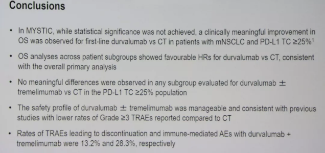 MYSTIC研究是一项随机、开放标签的国际多中心III期临床研究,旨在探索durvalumab单药(PD-L1抑制剂)或联合tremelimumab(CTLA-4抑制剂)与标准化疗在局部晚期或转移性且EGFR和ALK野生型非小细胞肺癌(NSCLC)一线治疗的有效性与安全性。