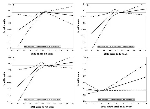 结论:20岁及受试10年前体重过轻与NPC风险下降显著相关。20岁时体型较大与NPC风险增高显著相关。