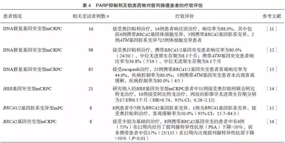 一项2 019例受试者的研究发现携带胚系BRCA1/2基因突变与更具侵袭性、更高概率的淋巴结、远端转移发生及更短的生存时间相关。TOPARP-A、TRITON2及TOPARP-B等多项大型临床研究均发现,具有DNA修复(特别是BRCA1/2)基因体细胞或胚系变异型mCRPC患者可能对PARP抑制剂敏感(表4)。目前PARP抑制剂尚未获得NMPA批准用于mCRPC患者的治疗,但有多项临床试验正在开展;同时有限的证据显示携带该分子特征的前列腺癌患者可能对铂类药物化疗敏感。国外数据显示,携带BRCA2基因突变的mCRPC患者比例为5%~9%,携带ATM基因突变的患者比例约为2%,携带BRCA1基因突变的患者比例约为1%;中国前列腺癌患者携带BRCA1/2及ATM基因突变比例的研究数据较为匮乏,近期发表的一项纳入316例中国前列腺癌患者的研究显示,6.33%的受试者携带BRCA2,0.63%的受试者携带BRCA1,0.63%的受试者携带ATM基因胚系致病变异。