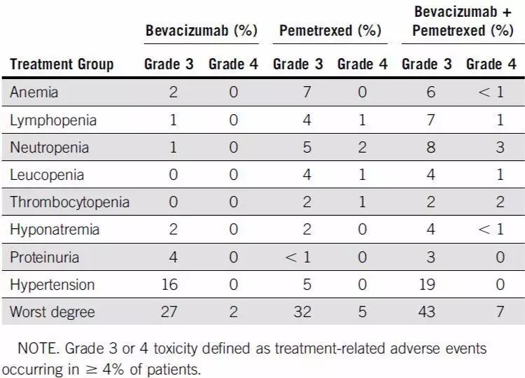 3. 安全性:培美曲塞组、贝伐珠单抗组和联合治疗组的中位维持治疗周期数分别为6周期、6周期和8周期。三组分别有18.3%、17%和21.7%的患者接受了超过12个周期的维持治疗。在维持治疗阶段,三组分别有38%、30%和51%的患者出现了3度及以上的不良反应。培美曲塞组、贝伐珠单抗组和联合治疗组最常见的3度及以上不良反应分别为贫血(5例)、高血压(16例)和高血压(19例)。导致治疗终止最常见的原因是疾病进展。其他3度及以上不良反应发生比例见图4。