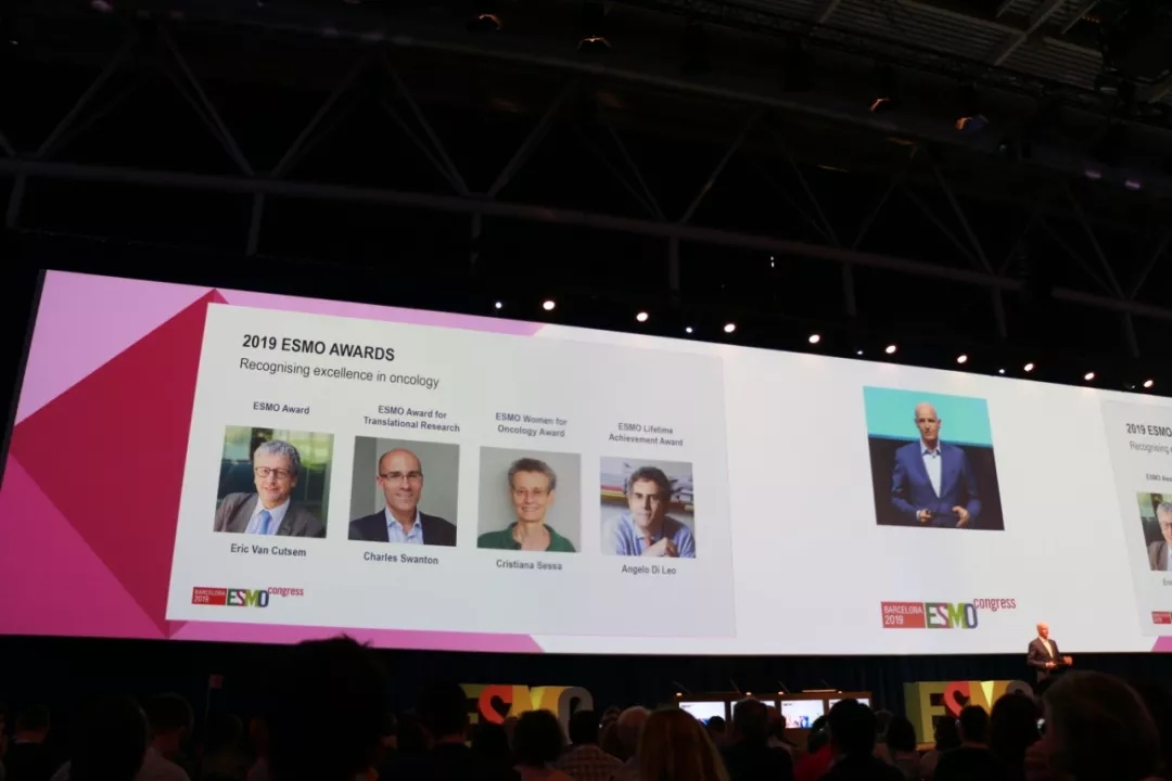 开幕式上,四位杰出的临床医生和科学家分获2019年度ESMO大奖,以表彰其在肿瘤学方面的卓越成就,分别是:比利时鲁汶盖斯堡大学附属医院消化肿瘤科主任、鲁汶大学内科教授Eric Van Cutsem教授获ESMO奖,英国弗朗西斯·克里克研究所 Charles Swanton 教授获ESMO 转化研究奖,瑞士贝林佐纳的瑞士南部肿瘤研究所(IOSI)妇科肿瘤顾问Cristiana Sessa 教授获ESMO女性肿瘤学奖,国际知名乳腺癌专家、意大利Prato医院Angelo Di Leo教授获ESMO终身成就奖。
