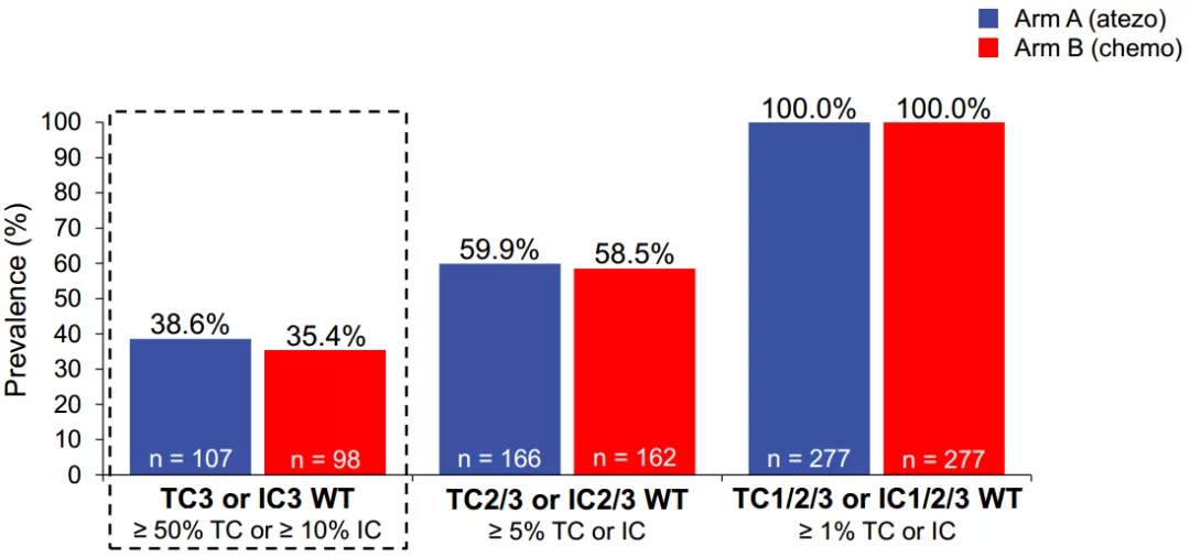 此次中期分析主要探索了免疫疗法在PD-L1阳性的EGFR/ALK野生型(WT)患者中能否获益,该研究根据PD-L1表达水平把患者分成三个组:TC3/IC3-WT亚组,TC/IC 2/3-WT和 TC/IC 1/2/3-WT亚组。