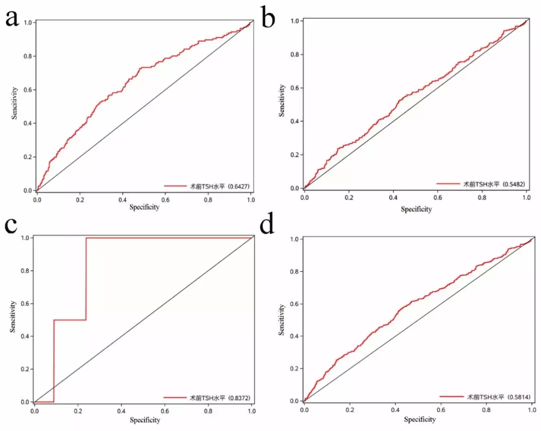 注:(a)甲状腺浸润术前TSH水平roc曲线。(b)淋巴结转移术前TSH水平roc曲线。(c)远处转移患者术前TSH水平roc曲线。(d)侵袭/转移术前TSH水平roc曲线。