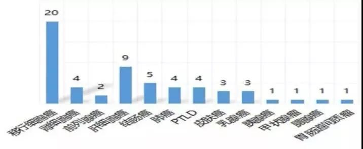 在恶性肿瘤类型方面,西方国家报道最常见的类型是皮肤癌,占比可达60%以上;其次,在见诸报道的数据中,移植后淋巴增殖性疾病(PTLD)和泌尿生殖系统肿瘤也很常见[4-5]。在亚洲国家中,日韩学者报道的最常见肿瘤类型是胃肠道肿瘤,占比约为27%[6-7]。泰国拉玛九院报道的最常见恶性肿瘤部位是泌尿生殖系统,其中移行细胞癌最高,达到35.1%(20/57)[2]
