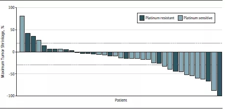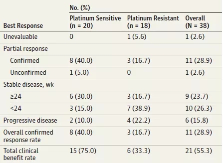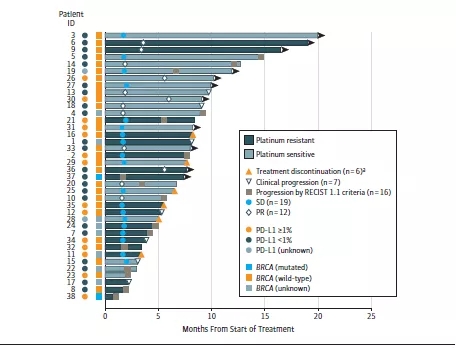 从2017年2月8日至2017年12月29日,来自美国丹娜法伯癌症研究院和麻省总院的38名复发性上皮性卵巢癌患者纳入该研究中,其中铂敏感者20例,铂耐药者18例。11例患者证实对纳武利尤单抗与贝伐珠单抗联合治疗有反应(ORR 28.9%,95%CI: 15.4%-45.9%),包括8例铂敏感患者(ORR 40%,95%CI:19.1%-64%),3例铂耐药患者(ORR16.7%,95%CI:3.6%-41.4%)。另外6例铂敏感患者和3例铂耐药患者疾病稳定持续至少24周。