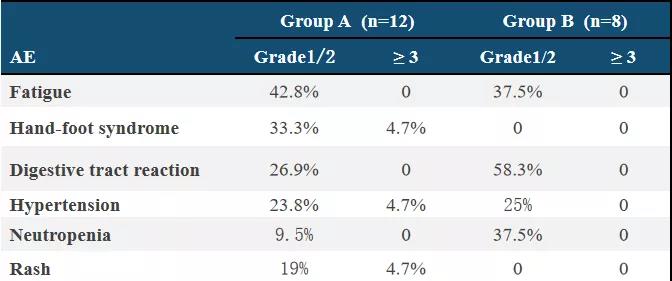 阿帕替尼组主要的1、2级不良事件是乏力(42.8%)、手足综合征(33.3%)、胃肠道反应(26.9%)、高血压(23.8%),对照组主要是胃肠道反应(58.3%)、中性粒细胞减少(37.5%)。阿帕替尼组发生3级不良事件是手足综合征(4.7%)、皮疹(4.7%)、高血压(4.7%)。期间无治疗相关死亡发生。